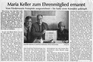 Dank Frau Maria Keller gibt es jetzt den Förderverein „Festspiele Moosburg“, denn Sie war es, die erste Kontakte zu der Familie Flohrschütz knüpfte. Sie holte Dr. Günther Flohrschütz als Referenten nach Moosburg und erfuhr so von dem Stück „Die verbotenen Stadt“. Prompt setzte sie sich mit dem damaligen Stadtmarketingreferenten Josef Birnkammer zusammen und brachte ihm ihr Anliegen vor. Damit war der Grundstein für den Förderverein Festspiele Moosburg gelegt. Auf Grund ihrer Verdienste wurde Maria Keller am 22.04.2008 zum 1. Ehrenmitglied des Fördervereins ernannt.